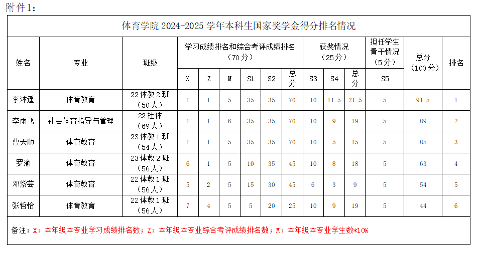 为全面贯彻国家教育方针,培养德智体美劳全面发展的社会主义建设者和接班人,树立先进典型,激励学生奋发向上,营造良好院风学风,根据《关于做好2024—2025学年本科生国家奖学金初评工作的通知》(学工字〔2025〕36号)、《体育学院关于评选2024—2025学年本科生国家奖学金的实施办法(暂行)》的文件精神和要求,对国家奖学金的评选结果进行公示,公式如下: