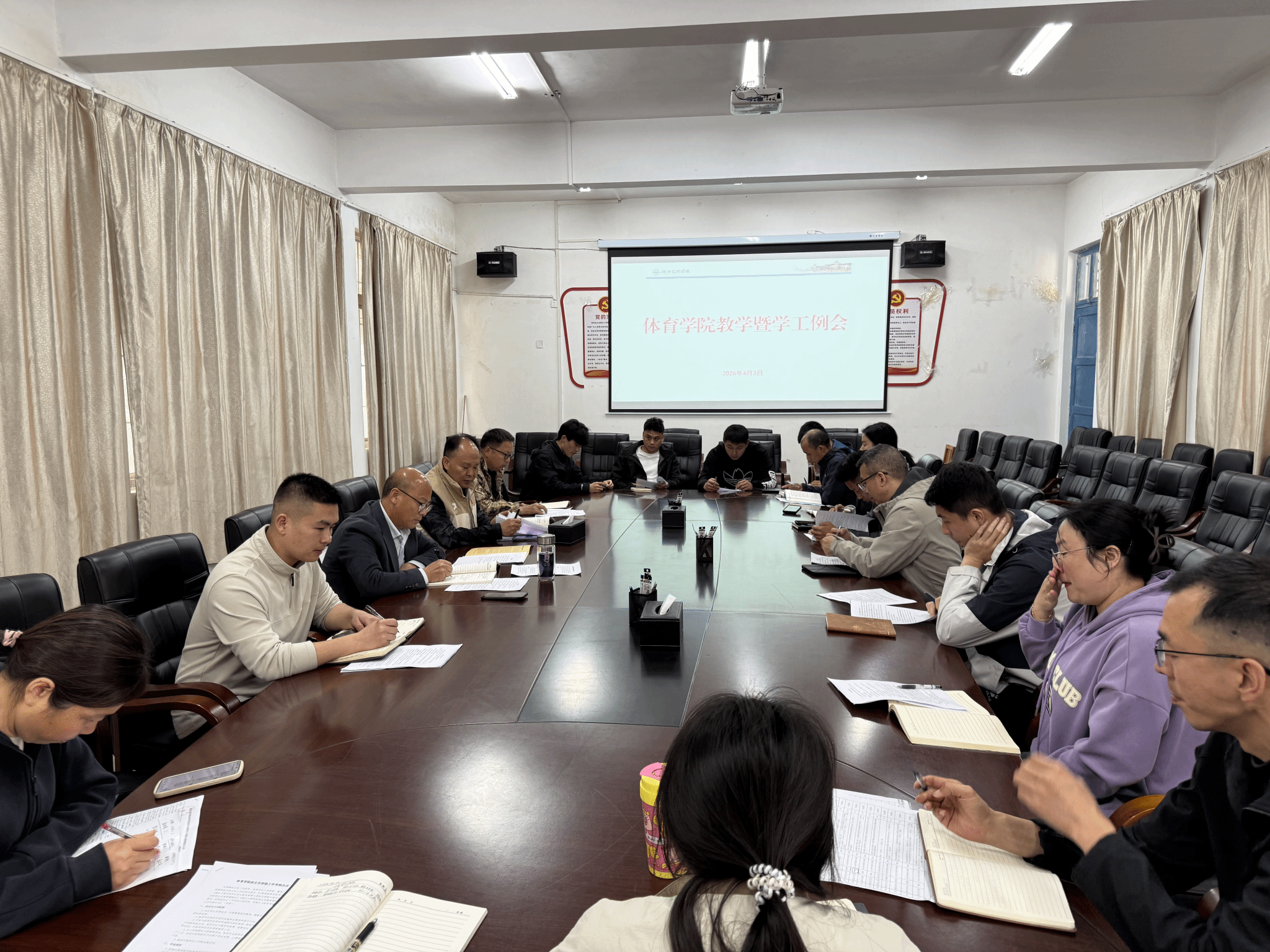 (通讯员 罗逸)2026年4月3日中午12时,体育学院在学院会议室召开4月教学暨学工例会。会议由学院副院长吉玉良主持,学院班子成员、各系部主任及书记、全体班主任、教学办主任及辅导员参加会议。会议围绕全年级学业问题与日常管理工作展开深入研讨。