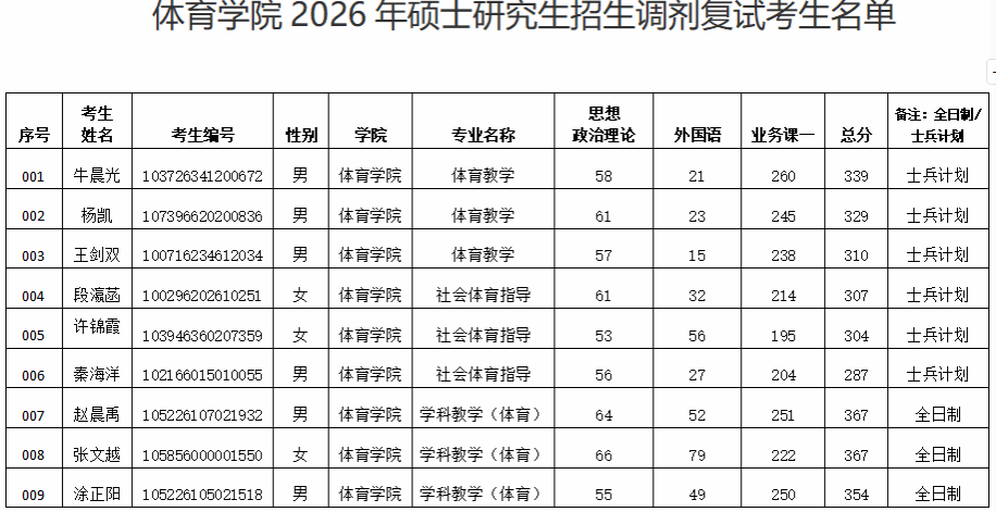 体育学院2026年硕士研究生招生调剂复试考生名单